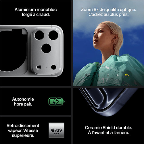 - Pour toutes les caractéristiques, visitez https://www.apple.com/ca/fr/iphone-17-pro/specs/